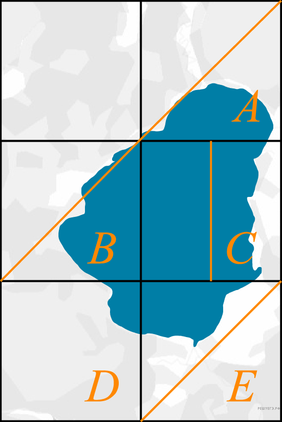 Площадь озера в квадрате B занимает немного меньше половины площади квадрата, а площадь озера в квадрате D заметно меньше половины площади квадрата. Перенесем часть озера из квадрата D в квадрат B, этим он будет почти заполнен наполовину.