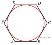 Диаметр вписанной окружности равен расстоянию между сторонами ED и АВ, то есть длине AE. Угол между сторонами правильного шестиугольника равен 120°. Пусть FН — высота равнобедренного треугольника AFE, тогда FН — его медиана и биссектриса, откуда Из прямоугольного треугольника
