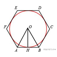 Пусть О — центр правильного шестиугольника, тогда радиус вписанной в шестиугольник окружности является высотой равностороннего треугольника АОВ, стороны которого ОА и ОВ — радиусы описанной окружности. Поэтому