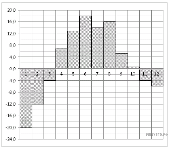 На диаграмме показана среднемесячная температура воздуха в Екатеринбурге (Свердловске) за каждый месяц 1973 года. По горизонтали указываются месяцы, по вертикали — температура в градусах Цельсия. Определите по диаграмме разность между наибольшей и наименьшей среднемесячными температурами в 1973 году. Ответ дайте в градусах Цельсия.