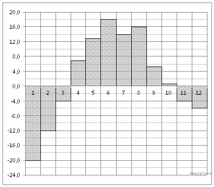 На диаграмме показана среднемесячная температура воздуха в Екатеринбурге (Свердловске) за каждый месяц 1973 года. По горизонтали указываются месяцы, по вертикали — температура в градусах Цельсия. Определите по диаграмме, на сколько градусов Цельсия март был в среднем холоднее августа.