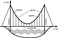 На рисунке изображена схема вантового моста. Вертикальные пилоны связаны провисающей цепью. Тросы, которые свисают с цепи и поддерживают полотно моста, называются вантами.